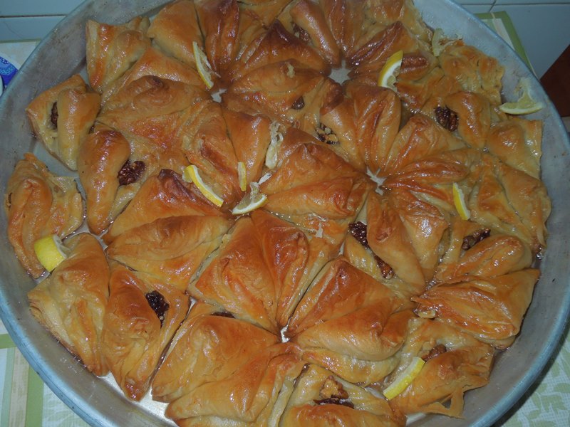 Se prepară un aluat din ingredientele menționate. Se lasă o oră sa se odihnească. Se împarte aluatul în 18-20 bile. Fiecare bilă se frământă foarte bine și se unge cu ulei. Ulterior, din bilele formate se ăntinde foarte bine câte o foaie, se unge cu ulei, se așează câte trei foi unse una peste alta, și se răsucesc colțurile puțin în interior, pentru a forma un pătrat mai mare. Se presară bucăți de nucă în fiecare din cele 4 colțuri. Se aduc apoi colțurile spre interior (spre mijlocul pătratului), ca si cum s-ar închide un plic. Astfel de obțin 4 baclavale. Se procedează la fel cu restul foilor. Se coc baclavalele pe o foaie de copt, la temperatura potrivită, până se rumenesc. Siropul se pune fierbinte, peste baclavalele reci.
